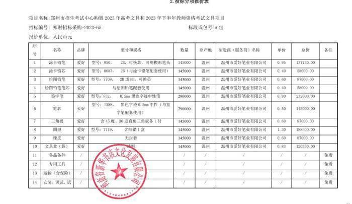 鄭州市招生考試中心購置2023年高考文具和2023年下半年教師資格考試文具項目報價信息 圖片來源:河南省政府采購網(wǎng)